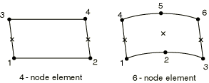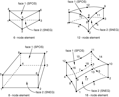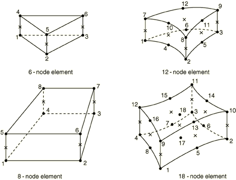 Area elementsIntegration points are indicated with an X and have the same numbers as the bottom face nodes, except that the point between nodes 17 and 18 in the 18-node gasket element is integration point number 9. |