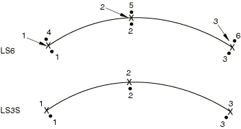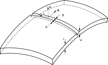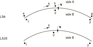 Element outputNodes 1, 2, and 3 on the element define side B and nodes 4, 5, and 6 define side A (see Figure 1). The sign of the crack is defined by the surface of the shell from which the crack originates, which you identify when you define the depth of the crack (see Line spring elements for modeling part-through cracks in shells). If the crack originates from the positive surface of the shell, sign(crack)=1.0; if the crack originates from the negative surface of the shell, sign(crack)=−1.0. The vector is defined by the right-hand rule from the cross product of the tangent, , which is positive going from node 1 to node 3 of the element, and the normal, , defined when the coordinates are given (or by a user-defined normal definition). For element type LS3S the vector must point into the model (away from the symmetry plane). For element type LS6 the vector must point from side A to side B. “Strains”