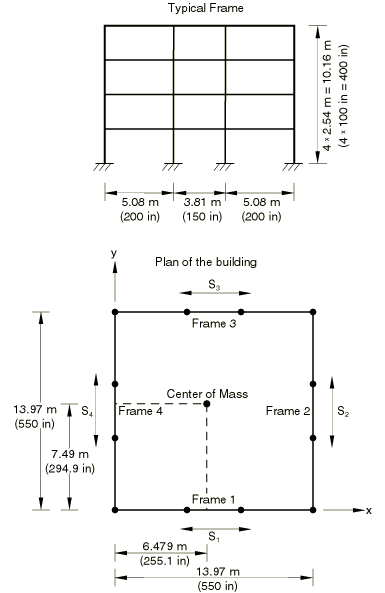 ProductsAbaqus/Standard Geometry and modelA four-story steel-frame building is analyzed. All columns in the building have the same geometric properties. However, as shown in Figure 1, the properties of the beams in Frames 1 and 2 are different, as compared to those in Frames 3 and 4, to move the center of mass of the structure away from its geometric center. Eigenvalue extraction performed on the model shows that many of the 30 modes that cover the frequency range up to 40 Hz are closely spaced. An acceleration spectrum based on the El Centro earthquake record is applied in the x–y plane. The Fortran program given in frameresponsespect_acc.f is used to generate the spectrum. The frequency range is chosen between 0.1 Hz and 40 Hz, and the number of points at which the spectrum is calculated is set at 501. Only one spectrum curve is requested for 2% damping. Results and discussionAs described in Linear analysis of a rod under dynamic loading, for structures with well-separated modes the TENP and the CQC methods reduce to the SRSS method, while the NRL and the ABS methods give similar results. Hence, for such structures, two summation rules would suffice, with ABS providing the more conservative results. However, when structures with closely spaced modes are analyzed, all five summation rules can yield very different results. This is even more apparent in three-dimensional problems. In the present example, the plane of the earthquake motion lies along the x-axis, so we expect that the structural response will be dominated by Frames 1 and 3 and will result in a significant base shear in the x-direction. All five methods are compared against a modal time history response using the same El Centro acceleration record in Table 1, where the base shear forces are summed up in the plane of each frame , where i is the frame number. This comparison shows that the best approximation is generated by the CQC method. The other methods overestimate the shear in the y-direction, and some of them underestimate the base shear in the x-direction. The CQC method is generally recommended for asymmetrical three-dimensional problems with closely spaced structural modes. This method takes into account the sign of the mode shapes through cross-modal correlation factors and can correctly predict the response in directions perpendicular to the direction of excitation. Input files