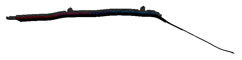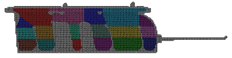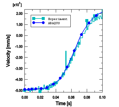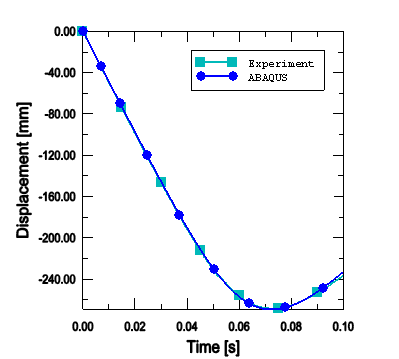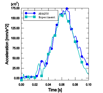 ProductsAbaqus/Explicit Geometry and modelThe side curtain airbag model described in this example was provided by Autoliv GmbH. The model setup is shown in Figure 1, which shows an impactor hitting the deployed side curtain airbag. The airbag is divided into 18 chambers to approximate the nonuniform distribution of the gases across the airbag and the gradients in pressure observed during the complex unfolding of the airbag. The temperature and pressure are considered to be uniform in each chamber at any point of time. Each airbag chamber is modeled as a surface-based fluid cavity. The surface-based fluid cavity capability provides a coupling between the pressure exerted by the contained gas on the chamber boundary and the deformation of the gas-filled chamber. The individual chambers are separated by fictitious partitions modeled with surface elements, which represent the area of fluid exchange between the different chambers. The airbag has three inflators located in chambers 1, 6, and 9 that are used to inflate the airbag. The inflators are activated at different times using inflation time amplitude definitions associated with the activation of fluid inflator definitions. The inflators inject a mixture of 6 gas species, with the molecular fraction, mass flow rate, and temperature of the individual species defined as functions of time. The gas species behave as ideal gases with an adiabatic temperature update. Leakage of the gases to the environment through the airbag fabric is modeled by specifying a discharge coefficient (ratio of the effective leakage area to the total airbag surface area) of 0.0003 for fluid exchange from each airbag chamber. In addition, the loss of heat energy to the environment is also considered by providing the heat energy flow rate as a function of the temperature difference across the airbag fabric. The external skin of the airbag is represented by 3-node membrane elements (M3D3) and uses a nonlinear elastic definition of the fabric material model. The fabric material model is calibrated by specifying the uniaxial behavior of the fibers in the warp and weft directions as well as the shear behavior of the fabric. The behavior of the fibers has been defined such that they offer negligible resistance to compression until a certain compressive strain limit beyond which they begin to offer finite resistance to compression to prevent excessive deformations of the fabric elements. Bilinear shear behavior is defined reflecting an initial shear modulus of =9.44 N/mm2 and a modulus of =47.2 N/mm2 at angles greater than 60° to prevent severe shear deformation. In addition, a small amount of stiffness proportional damping is applied. A reference mesh (initial metric) is defined to specify the unfolded stress-free configuration of the airbag. The unstressed reference configuration of the airbag is defined using the initial reference mesh for membrane elements. The initial folded configuration and the reference configuration are used to account for the wrinkles that arise from the airbag folding process. The reference mesh and the folded airbag configuration are shown in Figure 2 and Figure 3, respectively. The fabric material is defined such that any initial compressive strains along the yarn directions will cause compressive stresses in the yarn. Alternatively, the initial compressive strains along the yarn directions can be recovered stress free. The general contact algorithm is used to consider self-contact between the airbag fabric layers as well as contact with surrounding structures during the inflation of the airbag. The impactor is modeled as a rigid body with a total mass of 7.2 kg and is given an initial velocity of 4500 mm/s towards the deploying airbag. The mass and velocity of the impactor reflect human head mass and velocities typically observed in vehicle side impacts, respectively. Results and discussionThe airbag at different stages of deployment is shown in Figure 4 (8 ms) and Figure 5 (16 ms). Figure 6, Figure 7, and Figure 8 show the time history of displacement, velocity, and acceleration of the impactor as it impacts the airbag, along with comparisons to experimental results. These plots demonstrate the close correlation between Abaqus/Explicit simulation results and physical test results. Input files