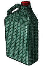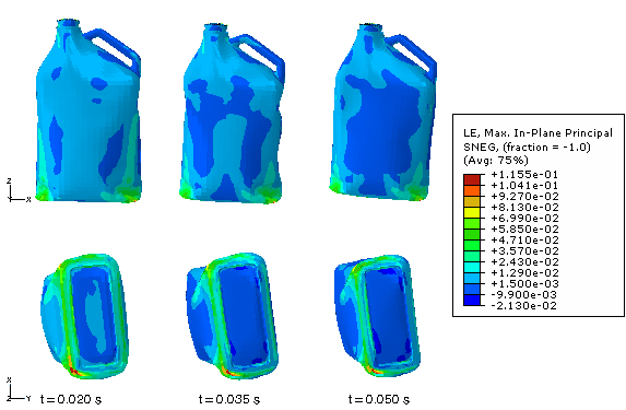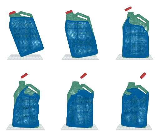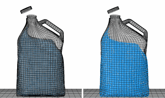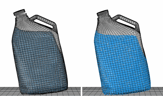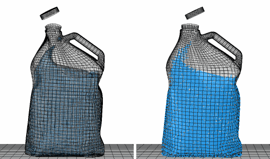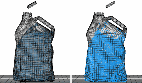 • using the Eulerian-Lagrangian contact formulation to simulate a highly dynamic event involving a fluid material (modeled using Eulerian elements) interacting with structural boundaries (modeled using Lagrangian elements),