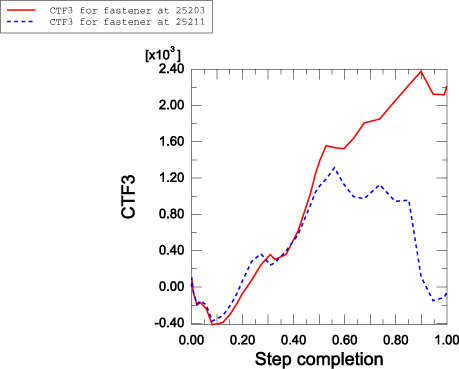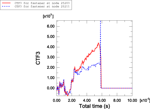 ![]() Figure 9. Connector force CTF3 in spot welds at reference nodes 25203 and 25211 for Abaqus/Standard.