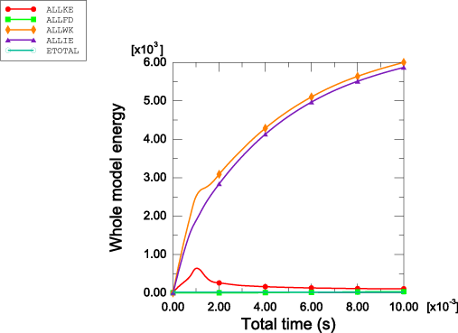 ![]() Figure 8. Time histories of the total kinetic energy, energy dissipated by friction, work done on the model, internal energy, and total energy.