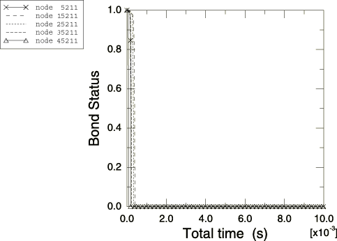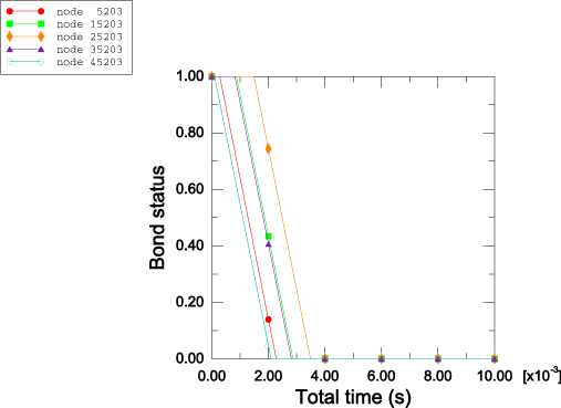 ![]() Figure 6. Time histories of the status of all spot welds on negative z-side of column.