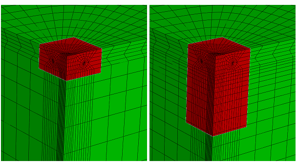 Adjusted global and submodel analyses that adhere to these guidelines are run. In this case the submodel driven surface is farther from the crack region and the high stress gradient, and the global model mesh is refined so that elements are more uniform in the region of the submodel surface. Figure 14 shows a comparison of the submodel/global model pairs. The modeling arrangement on the left places the lower submodel boundary too near to the crack and high stress gradients and cuts through high aspect ratio elements. The arrangement on the right provides lower aspect ratio elements in the global model and positions the lower submodel boundary further from the crack. The adjusted analysis with the further boundary now matches the J-integral values for the full model to within 2%. This accuracy difference illustrates the importance of adhering to the guidelines for surface-based submodel design. In practice, in the absence of a reference global solution, you should use the following guidelines to ensure your surface-based solution is adequate: