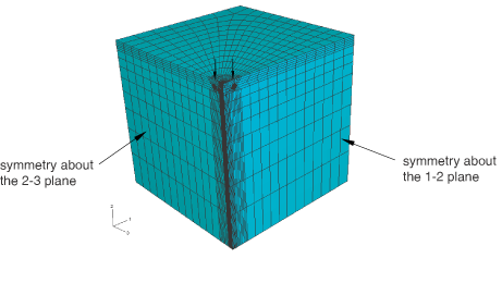 ProductsAbaqus/StandardAbaqus/CAE Application descriptionThis example examines the fracture behavior of a conical crack, which may result from a small hard object impacting a large brittle body. It shows how to evaluate the propensity of the crack to propagate under static loading but does not cover the event that formed the crack. The J-integral is a widely applied fracture mechanics parameter that relates to energy release associated with crack growth and is a measure of the deformation intensity at a crack tip. In practice, the calculated J-integral can be compared with a critical value for the material under consideration to predict fracture. The T-stress represents stress parallel to the crack face. Together, the T-stress and the J-integral provide a two-parameter fracture model describing Mode I elastic-plastic crack-tip stresses and deformation in plane strain or three dimensions over a wide range of crack configurations and loadings. The stress intensity factors, , relate to the energy release rate and measure the propensity for crack propagation. This example uses axisymmetric and three-dimensional models to demonstrate the Abaqus fracture mechanics capability, where the crack extension direction varies along a curved crack front. Submodeling and the use of infinite elements to simulate far-field boundaries are also demonstrated. GeometryThe problem domain contains a conical crack in an infinite solid half-space, as shown in Figure 1. The crack extension direction changes as the crack is swept around a circle. The units for this example are nonphysical; therefore, dimensions, loads, and material properties are described in terms of length and force units. The crack circumscribes a circle with a radius of 10 length units on the free surface. The crack intersects the free surface at 45° and extends 15 length units into the solid domain. MaterialsThe material is a linear elastic solid. Boundary conditions and loadingThe semi-infinite domain is constrained from rigid body motion. The applied load is a static pressure with a magnitude of 10 force/length2 applied on the circular free surface of the block circumscribed by the crack. The loading is illustrated in Figure 1. Abaqus modeling approaches and simulation techniquesThis example includes six cases demonstrating different modeling approaches using Abaqus/Standard. The crack is modeled as a seam since the crack surfaces in the unloaded state lie next to one another with no gap. The geometry is axisymmetric and can be modeled as such. However, the three-dimensional cases demonstrate the Abaqus fracture mechanics capability, where the crack extension direction varies along a curved crack front. The infinite half-space is treated using multiple techniques. In Case 1 through Case 4, the domain is extended well beyond the region of interest. Far-field boundary conditions applied a significant distance from the region of interest have negligible influence on the response near the crack. Cases 5 and Case 6 demonstrate the use of continuum infinite elements. Axisymmetric and three-dimensional cases are provided with and without submodeling. Fracture mechanics provides detailed information on fracture mechanics procedures. Summary of analysis cases