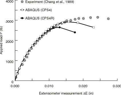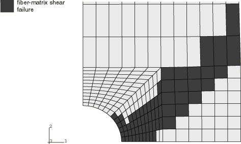 The corresponding finite element model consists of two layers of CPS4 plane stress elements, with thicknesses and properties as previously discussed. The quarter-symmetry finite element model is shown in Figure 1. The implementation of nonlinear material behavior with user-defined field variables is explicit: the nonlinearity is based on the state at the start of the increment. Hence, in Abaqus/Standard analyses the user must ensure that the time increments are sufficiently small, which is particularly important because the automatic time increment control in Abaqus/Standard is ineffective with the explicit nonlinearity implemented in USDFLD. If automatic time incrementation is used, the maximum time increment can be controlled from within subroutine USDFLD with the variable PNEWDT. This capability is useful if there are other nonlinearities that require automatic time incrementation. In this example the only significant nonlinearity is the result of the material behavior. Hence, fixed time incrementation can be used effectively. In Abaqus/Explicit analyses the stable time increment is usually sufficiently small to ensure good accuracy. Results and discussionFor this problem experimental load-displacement results were obtained by Chang and Lessard. The experimental results, together with the numerical results obtained with Abaqus/Standard, are shown in Figure 2. The agreement between the experimental and numerical results is excellent up to the point where the load maximum is reached. After that, the numerical load-displacement curve drops off sharply, whereas the experimental data indicate that the load remains more or less constant. Chang and Lessard also show numerical results: their results agree with the results obtained by Abaqus but do not extend to the region where the load drops off. The dominant failure mode in this plate is fiber/matrix shear: failure occurs first at a load of approximately 12.15 kN (2700 lbs) and continues to grow in a stable manner until a load of approximately 13.5 kN (3000 lbs) is reached. Figure 3 shows the extent of the damage in the Abaqus/Standard finite element model at the point of maximum load. In this figure an element is shaded if fiber/matrix shear failure has occurred at at least three integration points. These results also show excellent agreement with the results obtained by Chang and Lessard. As discussed earlier, the sharp load drop-off in the numerical results is the result of the lack of residual stress carrying capacity after the failure criterion is exceeded. Better agreement could be reached only if postfailure material data were available. Without postfailure data the results are very sensitive to the mesh and element type, which is clearly demonstrated by changing the element type from CPS4 (full integration) to CPS4R (reduced integration). The results are virtually identical up to the point where first failure occurs. After that point the damage in the CPS4R model spreads more rapidly than in the CPS4 model until a maximum load of about 12.6 kN (2800 lbs) is reached. The load then drops off rapidly. The problem is also analyzed with Abaqus/Standard models consisting of S4R and S4 elements. The elements have a composite section with two layers, with each layer thickness equal to the thickness of the plane stress elements in the CPS4 and CPS4R models. The results that were obtained with the S4R and S4 element models are indistinguishable from those obtained with the CPS4R element model. The numerical results obtained with Abaqus/Explicit using the CPS4R element model (not shown) are consistent with those obtained with Abaqus/Standard. Input filesAbaqus/Standard input files
