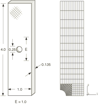 ProductsAbaqus/StandardAbaqus/Explicit Problem description and material behaviorA composite plate with a hole in the center is subjected to in-plane compression. The plate is made of 24 plies of T300/976 graphite-epoxy in a [(−45/+45)] layup. Each ply has a thickness of 0.1429 mm (0.005625 in); thus, the total plate thickness is 3.429 mm (0.135 in). The plate has a length of 101.6 mm (4.0 in) and a width of 25.4 mm (1.0 in), and the diameter of the hole is 6.35 mm (0.25 in). The plate is loaded in compression in the length direction. The thickness of the plate is sufficient that out-of-plane displacements of the plate can be ignored. The compressive load is measured, as well as the length change between two points, originally a distance of 25.4 mm (1.0 in) apart, above and below the hole. The plate geometry is shown in Figure 1. The material behavior of each ply is described in detail by Chang and Lessard. The initial elastic ply properties are longitudinal modulus =156512 MPa (22700 ksi), transverse modulus =12962 MPa (1880 ksi), shear modulus =6964 MPa (1010 ksi), and Poisson's ratio =0.23. The material accumulates damage in shear, leading to a nonlinear stress-strain relation of the form where is the (initial) ply shear modulus and the nonlinearity is characterized by the factor =2.44×10−8 MPa−3 (0.8×1−5 ksi−3). Failure modes in laminated composites are strongly dependent on geometry, loading direction, and ply orientation. Typically, one distinguishes in-plane failure modes and transverse failure modes (associated with interlaminar shear or peel stress). Since this composite is loaded in-plane, only in-plane failure modes need to be considered, which can be done for each ply individually. For a unidirectional ply as used here, five failure modes can be considered: matrix tensile cracking, matrix compression, fiber breakage, fiber matrix shearing, and fiber buckling. All the mechanisms, with the exception of fiber breakage, can cause compression failure in laminated composites. The failure strength in laminates also depends on the ply layup. The effective failure strength of the layup is at a maximum if neighboring plies are orthogonal to each other. The effective strength decreases as the angle between plies decreases and is at a minimum if plies have the same direction. (This is called a ply cluster.) Chang and Lessard have obtained some empirical formulas for the effective transverse tensile strength; however, in this model we ignore such effects. Instead, we use the following strength properties for the T300/976 laminate: transverse tensile strength =102.4 MPa (14.86 ksi), ply shear strength =106.9 MPa (15.5 ksi), matrix compressive strength =253.0 MPa (36.7 ksi), and fiber buckling strength =2707.6 MPa (392.7 ksi). The strength parameters can be combined into failure criteria for multiaxial loading. Four different failure modes are considered in the model analyzed here.