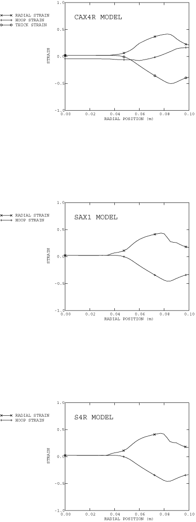 ProductsAbaqus/Standard Deep drawing of sheet metal is an important manufacturing technique. In the deep drawing process a “blank” of sheet metal is clamped by a blank holder against a die. A punch is then moved against the blank, which is drawn into the die. Unlike the operation described in the hemispherical punch stretching example (Stretching of a thin sheet with a hemispherical punch), the blank is not assumed to be fixed between the die and the blank holder; rather, the blank is drawn from between these two tools. The ratio of drawing versus stretching is controlled by the force on the blank holder and the friction conditions at the interface between the blank and the blank holder and the die. Higher force or friction at the blank/die/blank holder interface limits the slip at the interface and increases the radial stretching of the blank. In certain cases drawbeads, shown in Figure 1, are used to restrain the slip at this interface even further. To obtain a successful deep drawing process, it is essential to control the slip between the blank and its holder and die. If the slip is restrained too much, the material will undergo severe stretching, thus potentially causing necking and rupture. If the blank can slide too easily, the material will be drawn in completely and high compressive circumferential stresses will develop, causing wrinkling in the product. For simple shapes like the cylindrical cup here, a wide range of interface conditions will give satisfactory results. But for more complex, three-dimensional shapes, the interface conditions need to be controlled within a narrow range to obtain a good product. During the drawing process the response is determined primarily by the membrane behavior of the sheet. For axisymmetric problems in particular, the bending stiffness of the metal yields only a small correction to the pure membrane solution, as discussed by Wang and Tang (1988). In contrast, the interaction between the die, the blank, and the blank holder is critical. Thus, thickness changes in the sheet material must be modeled accurately in a finite element simulation, since they will have a significant influence on the contact and friction stresses at the interface. In these circumstances the most suitable elements in Abaqus are the 4-node reduced-integration axisymmetric quadrilateral, CAX4R; the first-order axisymmetric shell element, SAX1; the first-order axisymmetric membrane element, MAX1; the first-order finite-strain quadrilateral shell element, S4R; the fully integrated general-purpose finite-membrane-strain shell element, S4; and the 8-node continuum shell element, SC8R. Membrane effects and thickness changes are modeled properly with CAX4R. However, the bending stiffness of the element is low. The element does not exhibit “locking” due to incompressibility or parasitic shear. It is also very cost-effective. For shells and membranes the thickness change is calculated from the assumption of incompressible deformation of the material. Geometry and modelThe geometry of the problem is shown in Figure 2. The circular blank being drawn has an initial radius of 100 mm and an initial thickness of 0.82 mm. The punch has a radius of 50 mm and is rounded off at the corner with a radius of 13 mm. The die has an internal radius of 51.25 mm and is rounded off at the corner with a radius of 5 mm. The blank holder has an internal radius of 56.25 mm. The blank is modeled using 40 elements of type CAX4R or 31 elements of type SAX1, MAX1, S4R, S4, or SC8R. An 11.25° wedge of the circular blank is used in the three-dimensional S4R and S4 models. These meshes are rather coarse for this analysis. However, since the primary interest in this problem is to study the membrane effects, the analysis will still give a fair indication of the stresses and strains occurring in the process. The contact between the blank and the rigid punch, the rigid die, and the rigid blank holder is modeled with a contact pair. The top and bottom surfaces of the blank are defined as surfaces in the model. The rigid punch, the die, and the blank holder are modeled as analytical rigid surfaces. The mechanical interaction between the contact surfaces is assumed to be frictional contact. Therefore, friction is used in conjunction with the various contact property definitions to specify coefficients of friction. At the start of the analysis for the CAX4R model, the blank is positioned precisely on top of the die and the blank holder is precisely in touch with the top surface of the blank. The punch is positioned 0.18 mm above the top surface of the blank. In the case of shells and membranes, the positioning of the blank depends on the contact formulation used. Node-to-surface and surface-to-surface contact formulations are available in Abaqus/Standard. For the node-to-surface formulation, the shell/membrane thickness is modeled using an exponential pressure-overclosure relationship (Contact pressure-overclosure relationships). The blank holder is positioned a fixed distance above the blank. This fixed distance is the distance at which the contact pressure is set to zero using an exponential pressure-overclosure relationship. However, the surface-to-surface contact formulation automatically takes thickness into account, and the need for specifying pressure overclosure relations is eliminated. Examples of the surface-to-surface contact formulation with S4 and S4R elements are provided in this problem. Material propertiesThe material (aluminum-killed steel) is assumed to satisfy the Ramberg-Osgood relation between true stress and logarithmic strain: The reference stress value, K, is 513 MPa; and the work-hardening exponent, n, is 0.223. The Young's modulus is 211 GPa, and the Poisson's ratio is 0.3. An initial yield stress of 91.3 MPa is obtained with these data. The stress-strain curve is defined in piecewise linear segments in the metal plasticity specification, up to a total (logarithmic) strain level of 