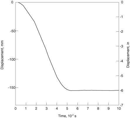 Solution controlAutomatic time stepping is used, with an initial time increment of 100 sec and the value of the half-increment residual tolerance, set to 4448 N (1000 lb). This value is based on actual force values expected (in this case, the blowdown force): HAFTOL is chosen to be about 10% of peak real forces. This should give good accuracy in the dynamic integration.