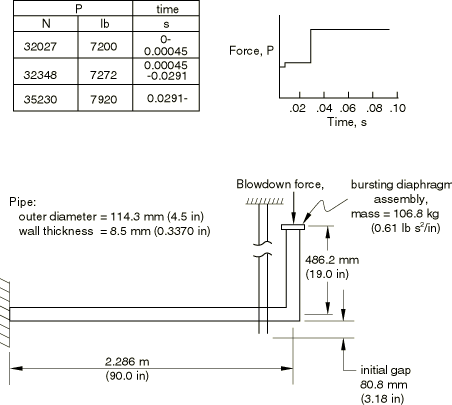 ProductsAbaqus/Standard Geometry and modelThe geometry and loading are shown in Figure 1. The pipe has a straight run of length 2.286 m (90 in), a very stiff elbow, and a cantilever “stick” 482.6 mm (19 in) long. A bursting diaphragm is installed at the end of the “stick” to initiate the blowdown. The restraint is a set of three U-bolts coupled together. The blowdown force history measured in the experiment is also shown in Figure 1. All dimensions, material properties, and this force history are taken from Esswein et al. (1978). The horizontal pipe run is modeled with eight elements of type B23 (cubic interpolation beam with planar motion), and the stick is modeled with two elements of the same type. The elbow is treated as a fully rigid junction, so the node at the elbow is shared between the two branches. The bursting diaphragm structure is modeled as a lumped mass of 106.8 kg (0.61 lb s2/in). The restraint is modeled as a single truss element. For the pipe the Young's modulus is 207 GPa (30 × 106 lb/in2), the initial yield stress is 214 MPa (31020 lb/in2), and the work hardening modulus is 8460.2 MPa (1227000.2 lb/in2) after yield. The restraint has an elastic stiffness of 131.35 MN/m (750000 lb/in), a yield force of 16681 N (3750 lb), and—when yielding—a force-displacement response 2.2716 0.235 MN/m (129710.235 lb/in). These values are taken from Esswein et al. (1978), where it is stated that they are based on measurements of static values with the stresses and forces increased by 50% in the plastic range to account for strain-rate effects. When it is known that strain-rate effects are important to the response it is preferable to model them directly, using a rate-dependent viscoplastic model. This has not been done in this case because the actual material is not specified. Isotropic hardening is assumed for both the pipe and the restraint since the plastic flows are presumed to be in the large flow regime and not just incipient plasticity (where the Bauschinger effect can be important). The cross-section of the pipe is integrated with a seven-point Simpson rule: this should be of sufficient accuracy for this problem. Generally, in beam-like problems without repeated large magnitude excitation, a higher-order integration scheme would show only significantly different results at late times in the response, and then the differences are not too important in models of this rather unrefined level. Esswein et al. (1978) provide the blowdown force-time history shown in Figure 1. This is applied as a point load at the end of the stick. In reality the fluid force during blowdown occurs at the piping elbows; but, since the displacements remain small, this detail is not important.