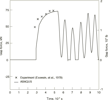 Results and discussionThe displacement of the node that hits the restraint is shown in Figure 2, and the force between the pipe and restraint is shown in Figure 3. Some experimental results from Esswein et al. (1978) are shown in Figure 3. The analysis appears to predict the closure time and the peak force between the pipe and restraint quite well. However, the numerical solution (like the numerical solution given by Esswein et al., 1978) shows a slower force rise time than the experiment. A possible explanation may be the material model, where viscoplastic (strain-rate-dependent yield) effects have been modeled as enhanced yield values, as discussed above: this means that, at the high strain rate that occurs just after impact, the actual material can carry higher stresses than the model, and so will respond more stiffly. The oscillation in the gap force in Figure 3 after the initial loading of the restraint is presumably caused by the difference in the basic natural frequencies of the restraint and the pipe: this oscillation is sufficiently severe to cause two slight separations.