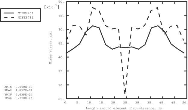 ![]() Figure 8. Mises stress distribution around the circumference of elements 451 and