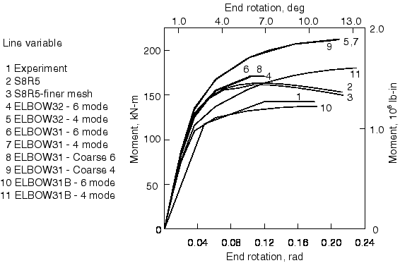 ProductsAbaqus/Standard Elbows are used in piping systems because they ovalize more readily than straight pipes and, thus, provide flexibility in response to thermal expansion and other loadings that impose significant displacements on the system. Ovalization is the bending of the pipe wall into an oval—i.e., noncircular—configuration. The elbow is, thus, behaving as a shell rather than as a beam. Straight pipe runs do not ovalize easily, so they behave essentially as beams. Thus, even under pure bending, complex interaction occurs between an elbow and the adjacent straight pipe segments; the elbow causes some ovalization in the straight pipe runs, which in turn tend to stiffen the elbow. This interaction can create significant axial gradients of bending strain in the elbow, especially in cases where the elbow is very flexible. This example provides verification of shell and elbow element modeling of such effects, through an analysis of a test elbow for which experimental results have been reported by Sobel and Newman (1979). An analysis is also included with elements of type ELBOW31B (which includes ovalization but neglects axial gradients of strain) for the elbow itself and beam elements for the straight pipe segments. This provides a comparative solution in which the interaction between the elbow and the adjacent straight pipes is neglected. The analyses predict the response up to quite large rotations across the elbow, so as to investigate possible collapse of the pipe and, particularly, the effect of internal pressure on that collapse. Geometry and modelThe elbow configuration used in the study is shown in Figure 1. It is a thin-walled elbow with elbow factor and radius ratio 3.07, so the flexibility factor from Dodge and Moore (1972) is 10.3. (The flexibility factor for an elbow is the ratio of the bending flexibility of an elbow segment to that of a straight pipe of the same dimensions, for small displacements and elastic response.) This is an extremely flexible case because the pipe wall is so thin. To demonstrate convergence of the overall moment-rotation behavior with respect to meshing, the two shell element meshes shown in Figure 2 are analyzed. Since the loading concerns in-plane bending only, it is assumed that the response is symmetric about the midplane of the system so that in the shell element model only one-half of the system need be modeled. Element type S8R5 is used, since tests have shown this to be the most cost-effective shell element in Abaqus (input files using element types S9R5, STRI65, and S8R for this example are included with the Abaqus release). The elbow element meshes replace each axial division in the coarser shell element model with one ELBOW32 or two ELBOW31 elements and use 4 or 6 Fourier modes to model the deformation around the pipe. Seven integration points are used through the pipe wall in all the analyses. This is usually adequate to provide accurate modeling of the progress of yielding through the section in such cases as these, where essentially monotonic straining is expected. The ends of the system are rigidly attached to stiff plates in the experiments. These boundary conditions are easily modeled for the ELBOW elements and for the fixed end in the shell element model. For the rotating end of the shell element model the shell nodes must be constrained to a beam node that represents the motion of the end plate using a kinematic coupling constraint as described below. The material is assumed to be isotropic and elastic-plastic, following the measured response of type 304 stainless steel at room temperature, as reported by Sobel and Newman (1979). Since all the analyses give results that are stiffer than the experimentally measured response, and the mesh convergence tests (results are discussed below) demonstrate that the meshes are convergent with respect to the overall response of the system, it seems that this stress-strain model may overestimate the material's actual strength. LoadingThe load on the pipe has two components: a “dead” load, consisting of internal pressure (with a closed end condition), and a “live” in-plane bending moment applied to the end of the system. The pressure is applied to the model in an initial step and then held constant in the second analysis step while the bending moment is increased. The pressure values range from 0.0 to 3.45 MPa (500 lb/in2), which is the range of interest for design purposes. The equivalent end force associated with the closed-end condition is applied as a follower force because it rotates with the motion of the end plane. Kinematic boundary conditionsThe fixed end of the system is assumed to be fully built-in. The loaded end is fixed into a very stiff plate. For the ELBOW element models this condition is represented by the NODEFORM boundary condition applied at this node. In the shell element model this rigid plate is represented by a single node, and the shell nodes at the end of the pipe are attached to it by using a kinematic coupling constraint and specifying that all degrees of freedom at the shell nodes are constrained to the motion of the single node. Results and discussionThe moment-rotation responses predicted by the various analysis models and measured in the experiment, all taken at zero internal pressure, are compared in Figure 3. The figure shows that the two shell models give very similar results, overestimating the experimentally measured collapse moment by about 15%. The 6-mode ELBOW element models are somewhat stiffer than the shell models, and those with 4 Fourier modes are much too stiff. This clearly shows that, for this very flexible system, the ovalization of the elbow is too localized for even the 6-mode ELBOW representation to provide accurate results. Since we know that the shell models are convergent with respect to discretization, the most likely explanation for the excessive stiffness in comparison to the experimentally measured response is that the m