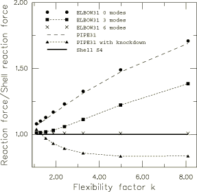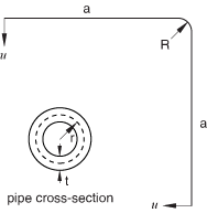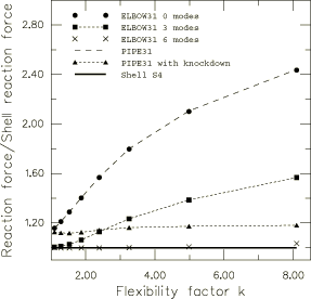ProductsAbaqus/StandardAbaqus/Explicit Elbows are used in piping systems because they ovalize more readily than straight pipes and, thus, provide flexibility in response to thermal expansion and other loadings that impose significant displacements on the system. Ovalization is the bending of the pipe wall into an oval—i.e., noncircular—configuration. The elbow is, thus, behaving as a shell rather than as a beam. Geometry and modelThe pipeline configuration used in the study is shown in Figure 1. It is a simple model with two straight pipe sections connected by a 90° elbow. The straight pipes are 25.4 cm (10.0 inches) in length, the radius of the curved section is 10.16 cm (4.0 inches), and the outer radius of the pipe section is 1.27 cm (0.5 inches). The wall thickness of the pipe is varied from 0.03175 cm to 0.2032 cm (0.0125 inches to 0.08 inches) in a parametric study, as discussed below. The pipe material is assumed to be isotropic linear elastic with a Young's modulus of 194 GPa (28.1 × 106 psi) and a Poisson's ratio of 0.0. The straight portions of the pipeline are assumed to be long enough so that warping at the ends of the structure is negligible. Two loading conditions are analyzed. The first case is shown in Figure 1 with unit inward displacements imposed on both ends of the structure. This loading condition has the effect of closing the pipeline in on itself. In the second case the sense of the applied unit displacements is outward, opening the pipeline. Both cases are considered to be large-displacement/small-strain analyses. A parametric study comparing the results obtained with different element types (shells, elbows, and pipes) over a range of flexibility factors, k, is performed. As defined in Dodge and Moore (1972), the flexibility factor for an elbow is the ratio of the bending flexibility of the elbow segment to that of a straight pipe of the same dimensions, assuming small displacements and an elastic response. When the internal (gauge) pressure is zero, as is assumed in this study, k can be approximated as where R is the bend radius of the curved section, r is the mean radius of the pipe, t is the wall thickness of the pipe, and is Poisson's ratio. Changes in the flexibility factor are introduced by varying the wall thickness of the pipe. The pipeline is modeled with three different element types: S4 shell elements, ELBOW31 elbow elements, and PIPE31 pipe elements. The S4 shell element model consists of a relatively fine mesh of 40 elements about the circumference and 75 elements along the length. This mesh is deemed fine enough to capture the true response of the pipeline accurately, although no mesh convergence studies are performed. Two analyses are conducted with the shell mesh: one with automatic stabilization using a constant damping factor (see Automatic stabilization of static problems with a constant damping factor), and one with adaptive automatic stabilization (see Adaptive automatic stabilization scheme). The pipe and elbow element meshes consist of 75 elements along the length; the analyses with these element types do not use automatic stabilization. The results of the shell element model with automatic stabilization using a constant damping factor are taken as the reference solution. The reaction force at the tip of the pipeline is used to evaluate the effectiveness of the pipe and elbow elements. In addition, the ovalization values of the pipeline cross-section predicted by the elbow element models are compared. The elbow elements are tested with 0, 3, and 6 Fourier modes, respectively. In general, elbow element accuracy improves as more modes are used, although the computational cost increases accordingly. In addition to standard pipe elements, tests are performed on pipe elements with a special flexibility knockdown factor. Flexibility knockdown factors (Dodge and Moore, 1972) are corrections to the bending stiffness based upon linear semianalytical results. They are applied to simple beam elements in an attempt to capture the global effects of ovalization. The knockdown factor is implemented in the PIPE31 elements by scaling the true thickness by the flexibility factor; this is equivalent to scaling the moment of inertia of the pipe element by . Results and discussionThe results obtained with the shell element model with automatic stabilization using a constant damping factor are taken as the reference solution. Very similar results are obtained with the same mesh using the adaptive automatic stabilization scheme. The tip reaction forces due to the inward prescribed displacements for the various analysis models are shown in Figure 2. The results are normalized with respect to those obtained with the shell model. The results obtained with the ELBOW31 element model with 6 Fourier modes show excellent agreement with the reference solution over the entire range of flexibility factors considered in this study. The remaining four models generally exhibit excessively stiff response for all values of k. The PIPE31 element model, which uses the flexibility knockdown factor, shows a relatively constant error of about 20% over the entire range of flexibility factors. The 0-mode ELBOW31 element model and the PIPE31 element model without the knockdown factor produce very similar results for all values of k. The normalized tip reaction forces due to the outward unit displacement for the various analysis models are shown in Figure 3. Again, the results obtained with the 6-mode ELBOW31 element model compare well with the reference shell solution. The 0-mode and 3-mode ELBOW31 and the PIPE31 (without the flexibility knockdown factor) element models exhibit overly stiff response. The PIPE31 element model with the knockdown factor has a transition region near k = 1.5, where the response changes from being too stiff to being too soft. The results in Abaqus/Explicit for pipe elements are consistent with those obtained in Abaqus/Standard. Figure 4 and Figure 5 illu