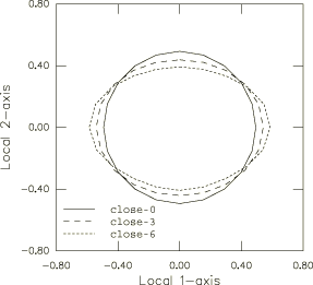 ![]() Figure 4. Ovalization of the ELBOW31 cross-sections for 0, 3, and 6 Fourier modes: closing displacement case.