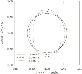 ![]() Figure 5. Ovalization of the ELBOW31 cross-sections for 0, 3, and 6 Fourier modes: opening displacement case.