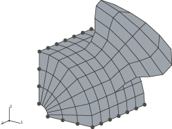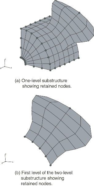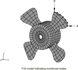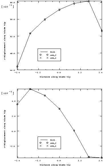 Both a frequency analysis and a static analysis are performed on the first three models. Static analysis followed by a frequency extraction and a modal-based steady-state dynamic analysis are performed for the cyclic symmetry model. Stress- and load-stiffening effects due to the centrifugal loading on the fan are built into the substructure stiffness during generation using a preload step with large-displacement formulation. To get the proper stress stiffening in the hub of the multi-level substructure, the centrifugal load defined in the lowest-level substructure (the blade) needs to be captured with a substructure load case and must be applied as a substructure load in the next-level substructure. To improve the representation of the substructure's dynamic behavior in the global analysis, m dynamic modes, which are extracted using an eigenfrequency extraction step, are included during the substructure generation using eigenmode selection. The reduced mass matrix obtained with the default value of corresponds to the Guyan reduction technique, while corresponds to the restrained mode addition technique. In the “Results and discussion” section below the solution obtained for the model without substructures (the “full model”) is used as the reference solution. For the cyclic symmetry model without substructures the eigenvalue extraction procedure is performed on the preloaded structure. The nonlinear static step has the centrifugal load applied to the blade. Eigenvalues are requested using the Lanczos eigenvalue solver, which is the only eigensolver that can be used for an eigenfrequency analysis with the cyclic symmetry analysis technique. The specification of cyclic symmetry modes in an eigenvalue analysis is demonstrated in one problem. This makes it possible to extract only the eigenmodes that have the requested cyclic symmetry. When this option is omitted, the eigenvalues are extracted for all possible (three) cyclic symmetry modes. In the discussion that follows the solution obtained for the cyclic symmetry model is compared to the solution for the entire 360° model (the reference solution). An eigenvalue analysis without the preload step is performed for the cyclic symmetry model with substructures. Twenty eigenvalues are extracted and compared to the reference solution obtained for the entire 360° model with substructures. The third step in the cyclic symmetry model problems is a frequency-domain, modal-based, steady-state procedure. It calculates the response to pressure loads projected on a specific cyclic symmetry mode. Results and discussionResults for the frequency analysis and the static analysis appear below. Frequency analysis for models with substructuresFrequencies corresponding to the 15 lowest eigenvalues are extracted and tabulated in Table 1 for each model. To study the effect of retaining dynamic modes during substructure generation, the substructure models are run after extracting 0, 5, and 20 dynamic modes during substructure generation. While the Guyan reduction technique (0) yields frequencies that are reasonable compared to those of the full model, the values obtained with 5 retained modes are much closer to full model predictions, especially for the higher eigenvalues. Increasing the number of retained modes to 20 does not yield a significant improvement in the results, consistent with the fact that in the Guyan reduction technique the choice of retained degrees of freedom affects accuracy, while for the restrained mode addition technique the modes corresponding to the lowest frequencies are by definition optimal. When substructures are used in an eigenfrequency analysis, it is to be expected that the lowest eigenfrequency in the substructure model is higher than the lowest eigenfrequency in the corresponding model without substructures. This is indeed the case for the single-level substructure analysis, but for the multi-level substructure analysis the lowest eigenfrequency is below the one for the full model. This occurs because the stress and load stiffness for the lowest-level substructure (the blade) are generated with the root of the blade fixed, whereas in the full model the root of the blade will move radially due to the deformation of the hub under the applied centrifugal load. Hence, the substructure stiffness is somewhat inaccurate. Since the radial displacements at the blade root are small compared to the overall dimensions of the model (of order 10−3), the resulting error should be small, as is observed from the results. Table 2 shows what happens if the NLGEOM parameter is omitted during the preloading steps. It is clear that the results are significantly different from the ones that take the effect of the preload on the stiffness into account. In this case the lowest eigenfrequency in the substructure models is indeed above the lowest eigenfrequency in the model without substructures. Static analysis for models with substructuresA static analysis of the fan is carried out about the preloaded base state by applying a pressure load of 105 Pa normal to the blades of the fan. The axial displacement of the outer edge of the fan blade due to the pressure load is monitored at nodes along path , as shown in Figure 1. The results are shown in Figure 4; there is good agreement between the solutions for the substructure models and the full model. While substructures can be generated from models that exhibit nonlinear response, it must be noted that, once created, a substructure always exhibits linear response at the usage level. Hence, a preloaded substructure will produce a response equivalent to that of the response to a linear perturbation load on a preloaded full model. Consequently, the full model is analyzed by applying the centrifugal preload in a general step and the pressure load in a linear perturbation step. Since an analysis using substructures is equivalent to a perturbation step, the results obtained do not incorporate the preload 