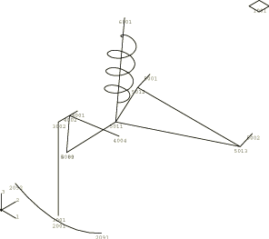 ProductsAbaqus/Standard JOINTC elements (Flexible joint element) can be used to model the interaction between two nodes that are almost coincident geometrically and that represent a joint that has internal stiffness and/or damping. The behavior of the joint is defined in a local coordinate system (Orientations). This system rotates with the motion of the first node of the element and may consist of linear or nonlinear springs and dashpots arranged in parallel, coupling the corresponding components of relative displacement and of relative rotation in the joint. This feature can be used to model, for example, a rubber bearing in a car suspension. In the connector element model the JOINTC elements are replaced by connector elements (see Connector elements) with connection types CARTESIAN to define the translational behavior and ROTATION to define the rotational behavior. These connection types allow linear or nonlinear spring and dashpot behavior to be defined in a local coordinate system that rotates with the first node on the element. Several different connection types can be used to model the finite rotational response. See Connection types for connection types using different finite rotation parametrizations. In this model the rotation magnitudes are assumed small. Hence, a rotation vector parametrization of the joint using ROTATION is appropriate. Geometry and modelThe structure analyzed is an automobile's left front suspension subassembly (see Figure 1). The physical components included in the assemblage are the tire, the wheel, the axle (hub), the A-arm (wishbone), the coil spring, and the frame. The tire is modeled with a JOINTC or connector element; a curved bar element has been attached for visualization. (The JOINTC or connector element is used because it is a convenient way of defining the tire's nonlinear stiffness in a local coordinate system.) The vertical stiffness of the wheel is represented by a beam element. The axle and A-arm are both modeled with beam elements. The axle is connected to the A-arm by a pin-type MPC in the JOINTC model or with connection type JOIN in the connector model. The coil spring is modeled by a SPRINGA element in the JOINTC model or with connection type AXIAL in the connector model. The automobile frame is represented by a MASS element. The top of the coil spring is connected directly to the frame, while the A-arm is connected to the frame by two JOINTC elements or two connector elements with connection types CARTESIAN and ROTATION (representing the A-arm bushings). The initial position represents a fully weighted vehicle, and the tire and coil spring have a corresponding initial preload. The first step in the analysis allows the suspension system to reach equilibrium. The second step models the tire moving over a bump in the road. The bump is idealized as a triangular shape 100 mm high by 400 mm long, and the vehicle is assumed to travel at 5 km/hr. A second input file is used to show the effects of large rotation on the suspension response. This file includes an initial rotation step, which rigidly rotates the model by 90° about the vertical axis but is otherwise identical to the first input file. We expect the response from the two analyses to be the same. In this example we are primarily interested in the equivalent rigid body motion of the A-arm and, in particular, in the average displacement and rotation. Results and discussionThe results from the connector element models are qualitatively and quantitatively equivalent to the JOINTC models. Hence, only the JOINTC results are discussed further. The vertical displacement histories in Step 2 are shown in Figure 2 for the contact point of the tire with the ground, the wheel center, and the frame. Figure 3 shows a series of overlaid displaced plots as the tire rolls up the bump. To verify the behavior of the JOINTC elements with large rotations, the second model rigidly rotates the entire structure by 90° before applying the bump excitation. Figure 4 shows the displacement time histories from the two models overlaid on the same plot. They are nearly identical. In the analysis of deformable bodies undergoing large motions it is convenient to obtain information about the equivalent rigid body motions: average displacement and rotation, as well as linear and angular momentum about the center of mass. For this purpose Abaqus provides a set of equivalent rigid body output variables. As indicated above, a secondary objective of this example is to demonstrate the use of these output variables, which represent the average motion of the specified element set. Element output requests to the results file and to the data file are included. If no element set is specified, the average motion of the entire model is given. This type of output can only be requested in a direct-integration implicit dynamic analysis, and only elements that have a mass will contribute to the equivalent rigid body motion. For a precise definition of the equivalent rigid body motion of a deformable body, see Equivalent rigid body dynamic motion. Figure 5 and Figure 6 have been generated using the equivalent rigid body output variables. Figure 5 shows the vertical motion of node 5001 (bearing point “A” of the A-arm), node 5080 (point of A-arm nearest the tire), and the average vertical motion of the A-arm (output variable UC3). As expected, the displacement of the center of mass of the component lies between the displacements of its two ends. Figure 6 shows the average rigid body rotation of the A-arm component about its center of mass. Rigid body rotations are available about the three global axes. Here we are interested in the rotation about the global X-axis (output variable URC1). The standard output for rotations is radians, but the results have been scaled to plot the rotation in degrees. Input files
