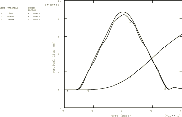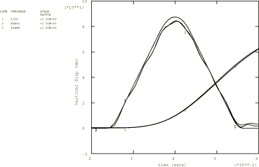 ![]() Figure 2. Displacement histories of tire, wheel center, and frame.