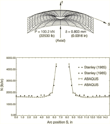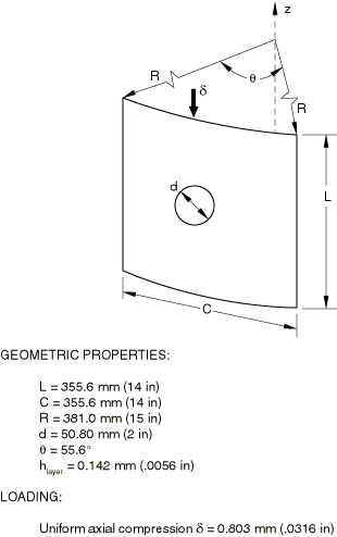 ProductsAbaqus/Standard The objective is to determine the strength of a thin, laminated composite shell, typical of shells used to form the outer surfaces of aircraft fuselages and rocket motors. Such analyses are complicated by the fact that these shells typically include local discontinuities—stiffeners and cutouts—which can induce substantial stress concentrations that can delaminate the composite material. In the presence of buckling this delamination can propagate through the structure to cause failure. In this example we study only the geometrically nonlinear behavior of the shell: delamination or other section failures are not considered. Some estimate of the possibility of material failure could presumably be made from the stresses predicted in the analyses reported here, but no such assessment is included in this example. The example makes extensive use of material orientation in a general shell section to define the multilayered, anisotropic, laminated section. The various orientation options for shells are discussed in Analysis of an anisotropic layered plate. General shell sections offer two methods of defining laminated sections: defining the thickness, material, and orientation of each layer or defining the equivalent section properties directly. The last method is particularly useful if the laminate properties are obtained directly from experiments or a separate preprocessor. This example uses both methods with a general shell section definition. Alternatively, you could use a shell section to analyze the model; however, because the material behavior is linear, no difference in solution would be obtained and the computational costs would be greater. Geometry and modelThe structure analyzed is shown in Figure 1 and was originally studied experimentally by Knight and Starnes (1984). The test specimen is a cylindrical panel with a 355.6 mm (14 in) square platform and a 381 mm (15 in) radius of curvature, so that the panel covers a 55.6° arc of the cylinder. The panel contains a centrally located hole of 50.8 mm (2 in) diameter. The shell consists of 16 layers of unidirectional graphite fibers in an epoxy resin. Each layer is 0.142 mm (.0056 in) thick. The layers are arranged in the symmetric stacking sequence {45/90/0/0/90/45} degrees repeated twice. The nominal orthotropic elastic material properties as defined by Stanley (1985) are