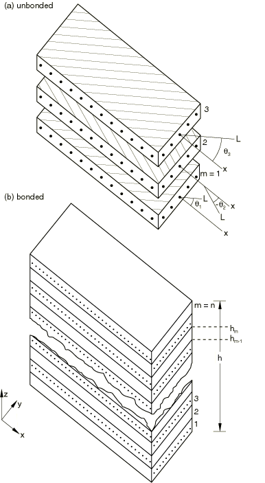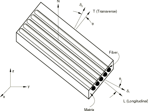 where the 1-direction is along the fibers, the 2-direction is transverse to the fibers in the surface of the lamina, and the 3-direction is normal to the lamina. The panel is fully clamped on the bottom edge, clamped except for axial motion on the top edge and simply supported along its vertical edges. Three analyses are considered. The first is a linear (prebuckling) analysis in which the panel is subjected to a uniform end shortening of 0.8 mm (.0316 in). The total axial force and the distribution of axial force along the midsection are used to compare the results with those obtained by Stanley (1985). The second analysis consists of an eigenvalue extraction of the first five buckling modes. The buckling loads and mode shapes are also compared with those presented by Stanley (1985). Finally, a nonlinear load-deflection analysis is done to predict the postbuckling behavior, using the modified Riks algorithm. For this analysis an initial imperfection is introduced. The imperfection is based on the fourth buckling mode extracted during the second analysis. These results are compared with those of Stanley (1985) and with the experimental measurements of Knight and Starnes (1984). The mesh used in Abaqus is shown in Figure 2. The anisotropic material behavior precludes any symmetry assumptions, hence the entire panel is modeled. The same mesh is used with the 4-node shell element (type S4R5) and also with the 9-node shell element (type S9R5); the 9-node element mesh, thus, has about four times the number of degrees of freedom as the 4-node element mesh. The 6-node triangular shell element STRI65 is also used; it employs two triangles for each quadrilateral element of the second-order mesh. Mesh generation is facilitated by specifying node fill and node mapping, as shown in the input data. In this model specification of the relative angle of orientation to define the material orientation within each layer, along with orthotropic elasticity in plane stress, makes the definition of the laminae properties straightforward. The shell elements used in this example use an approximation to thin shell theory, based on a numerical penalty applied to the transverse shear strain along the element edges. These elements are not universally applicable to the analysis of composites since transverse shear effects can be significant in such cases and these elements are not designed to model them accurately. Here, however, the geometry of the panel is that of a thin shell; and the symmetrical lay-up, along with the relatively large number of laminae, tends to diminish the importance of transverse shear deformation on the response. Relation between stress resultants and generalized strainsThe shell section is most easily defined by giving the layer thickness, material, and orientation, in which case Abaqus preintegrates to obtain the section stiffness properties. However, the user can choose to input the section stiffness properties directly instead, as follows. In Abaqus a lamina is considered as an orthotropic sheet in plane stress. The principal material axes of the lamina (see Figure 3) are longitudinal, denoted by L; transverse to the fiber direction in the surface of the lamina, denoted by T; and normal to the lamina surface, denoted by The constitutive relations for a general orthotropic material in the principal directions () are In terms of the data required to define orthotropic elasticity by specifying terms in the elastic stiffness matrix in Abaqus these are This matrix is symmetric and has nine independent constants. If we assume a state of plane stress, then is taken to be zero. This yields where The correspondence between these terms and the usual engineering constants that might be given for a simple orthotropic layer in a laminate is The parameters used on the right-hand side of the above equation are those that must be provided as part of the definition of orthotropic elasticity in plane stress. If the () system denotes the standard shell basis directions that Abaqus chooses by default, the local stiffness components must be rotated to this system to construct the lamina's contribution to the general shell section stiffness. Since represent fourth-order tensors, in the case of a lamina they are oriented at an angle to the standard shell basis directions used in Abaqus. Hence, the transformation is where are the stiffness coefficients in the standard shell basis directions used by Abaqus. Abaqus assumes that a laminate is a stack of laminae arranged with the principal directions of each layer in different orientations. The various layers are assumed to be rigidly bonded together. The section force and moment resultants per unit length in the normal basis directions in a given layer can be defined on this basis as where h is the thickness of the layer. This leads to the relations where the components of this section stiffness matrix are given by Here m indicates a particular layer. Thus, the depend on the material properties and fiber orientation of the mth layer. The 1,2 parameters are the shear correction coefficients as defined by Whitney (1973). If there are n layers in the lay-up, we can rewrite the above equations as a summation of integrals over the n laminae. The material coefficients will then take the form where the and in these equations indicate that the mth lamina is bounded by surfaces and See Figure 4 for the nomenclature. These equations define the coefficients required for the direct input of the section stiffness matrix method in the general shell section. Only the , , and submatrices are needed for that option. The three terms in , if required, are defined as part of the transverse shear stiffness. The section forces as defined above are in the normal shell basis directions. Applying these equations to the laminate defined for this example leads to the following overall section stiffness: or Results and discussionThe total axial force necessary to compress the panel 0.803 mm (