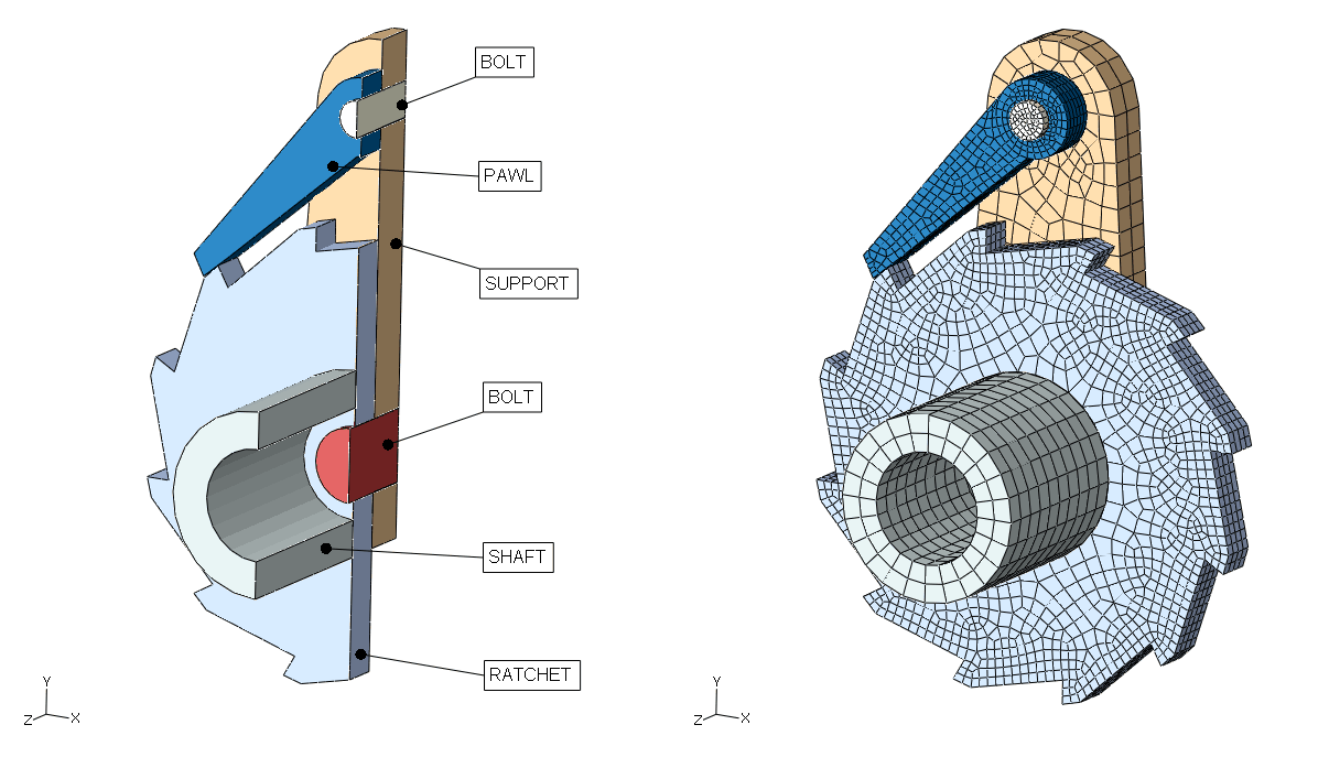 ![]() Figure 2. Geometry and mesh of the pawl-ratchet model.
