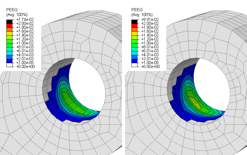![]() Figure 5. Distribution of equivalent plastic strain (PEEQ) near pawl hole for 2-step analysis (left) and 4-step analysis