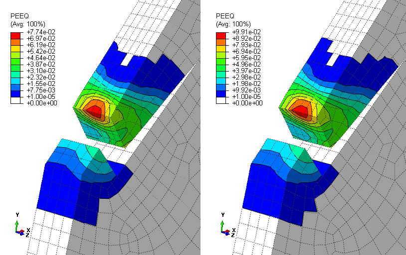![]() Figure 4. Distribution of equivalent plastic strain (PEEQ) near pawl tip for 2-step analysis (left) and 4-step analysis