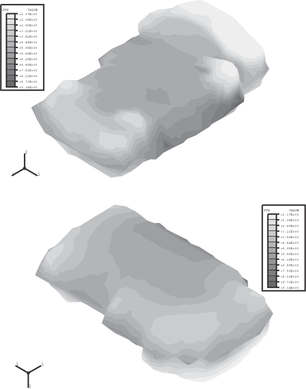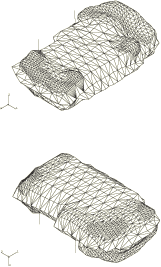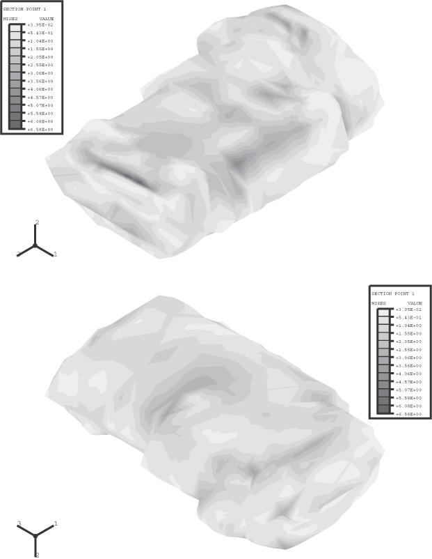ProductsAbaqus/Standard Geometry and modelThe mesh shown in Figure 1 is used in this example to model a fuel tank and its support straps. The mesh uses 2812 3-node shell elements (S3R), with the support straps modeled with 32 2-node beam elements (B31). Depending on the desired accuracy and detail of the solution, the analyst may identify some regions of the mesh in which additional refinement, or second-order elements, would be appropriate. The fuel tank would fit within a box of dimensions 450 mm × 200 mm × 680 mm. An internal pressure of 7 × 10−3 MPa is applied statically to the tank. Analyses are conducted for a uniform shell thickness of 5 mm and for a spatially varying shell thickness in the range 1.38 mm to 9.35 mm (see Figure 2), which is a more accurate representation of the tank. The uniform thickness analysis provides a comparison to judge the effects of variable thickness. The overall volume of plastic modeled in the variable thickness analysis is about 93% of that in the uniform thickness analysis. For the variable thickness analysis the shell cross-section indicates that the shell thickness is to be interpolated from nodal values specified with nodal thickness. For elements with more than one integration point, this approach results in a thickness that can vary over the element. The materials are modeled as isotropic elastic. The plastic fuel tank has a Young's modulus of 0.6 GPa and a Poisson's ratio of 0.3. The steel support straps have a Young's modulus of 206.8 GPa and a Poisson's ratio of 0.29. Geometrically nonlinear effects are significant in this example, so geometric nonlinearity is included in the step. Results and discussionContour plots of the Mises stress at the inner surface of the fuel tank (section point 1 in the shell elements) for the variable shell thickness and uniform shell thickness analyses are shown in Figure 3 and Figure 4. The ratio of the maximum Mises stress found in the variable thickness analysis to that found in the uniform thickness analysis is 1.5. For the variable thickness analysis, the maximum Mises stress occurs at a location where the fuel tank skin is relatively thin (see Figure 2 and Figure 3). Examination of the y-component of displacement shows that the overall expansion of the tank in the y-direction is about 1.5% greater in the variable thickness analysis. Input files