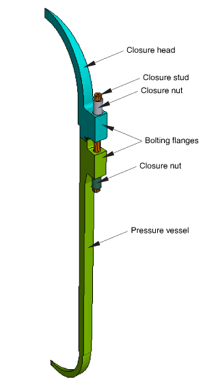 These loading conditions cover the most basic design requirements of a reactor vessel. A short and rapid temperature change is one of the most severe loading cases and will be considered in this example. The International System of units (SI) will be used in the following sections to describe the model. The analysis itself is performed in English units. The model and analysis are derived from details of the Shippingport pressurized water reactor (1958). GeometryThe problem domain comprises a cylindrical vessel shell, a hemispherical bottom head, a dome-shaped closure head, and the closure and seal assembly, as shown in Figure 1. The overall height of the vessel shell including the bottom head is 7650 mm (301 in). The bottom head has an inner radius of 1410 mm (55.5 in) and a thickness of 157 mm (6.18 in). The inner radius of the vessel shell is 1380 mm (54.5 in), and the thickness is 213 mm (8.40 in). The closure head has a height of 2330 mm (91.8 in), an inner radius of 1310 mm (51.5 in), and a thickness of 210 mm (8.25 in). The closure head is attached to the vessel shell by a seal and closure assembly. The assembly includes 40 stud bolts passing through the bolting flanges of the closure head and the vessel shell, each of which is restrained by two cap nuts. To complete the closure assembly, an omega seal is welded to the under surface of the closure head and top surface of the vessel shell. The stud bolt is 2290 mm (90 in) in length and has a diameter of 146 mm (5.75 in). The closure nuts are 304 mm (12 in) long with a thickness of 28.6 mm (1.13 in). Boundary conditions and loadingThe outside of the vessel is exposed to air that has a constant temperature of 21°C (70°F). The inside of the vessel is filled with hot water with an operating temperature of 320°C (600°F). During a cool-down process, the internal temperature is reduced by 38°C (100°F) in two hours. The water inside imposes a constant pressure of 1.38 × 107 Pa (2000 psi) on the internal surface of the vessel. Abaqus modeling approaches and simulation techniquesThe objective of this analysis is an understanding of stresses near the vessel-to-head interfaces. Although the assembly contains many features, such as inlet and outlet nozzles, the example ignores these details since they are far away from the vessel-to-head interface. The rest of the geometry is cyclically symmetric, which allows the example to model the entire 360° structure at a reduced computational expense by analyzing only a single repetitive sector of the model. Since there are 40 stud bolts along the circumference of the reactor vessel, the following analysis is performed on a 9° model with one sector as shown in Figure 2. The example also takes advantage of the fact that the thermal and mechanical responses of the vessel are only weakly coupled. Based on this fact, a sequentially coupled thermal-stress analysis is performed on the reactor vessel. The distribution of the temperature field is obtained first through a heat transfer analysis, then the mechanical response of the vessel is obtained by performing a static stress analysis with the temperature field specified using the results of the thermal analysis. Summary of analysis cases
