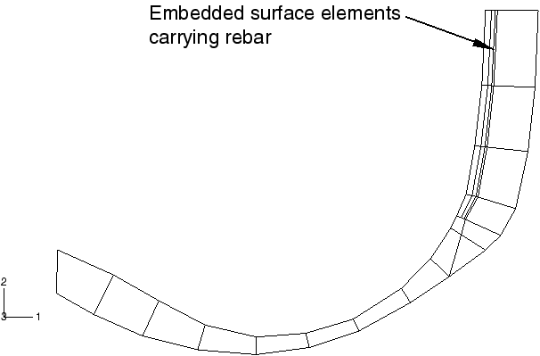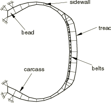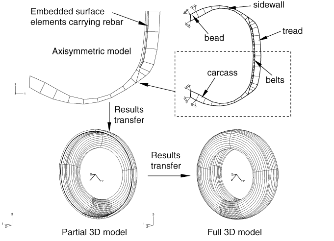 ProductsAbaqus/Standard Symmetric model generation (Symmetric model generation) can be used to create a three-dimensional model by revolving an axisymmetric model about its axis of revolution or by combining two parts of a symmetric model, where one part is the original model and the other part is the original model reflected through a line or a plane. Both model generation techniques are demonstrated in this example. Symmetric results transfer (Transferring results from a symmetric mesh or a partial three-dimensional mesh to a full three-dimensional mesh) allows the user to transfer the solution obtained from an axisymmetric analysis onto a three-dimensional model with the same geometry. It also allows the transfer of a symmetric three-dimensional solution to a full three-dimensional model. Both these results transfer features are demonstrated in this example. The results transfer capability can significantly reduce the analysis cost of structures that undergo symmetric deformation followed by nonsymmetric deformation later during the loading history. The purpose of this example is to obtain the footprint solution of a 175 SR14 tire in contact with a flat rigid surface, subjected to an inflation pressure and a concentrated load on the axle. Input files modeling a tire in contact with a rigid drum are also included. These footprint solutions are used as the starting point in Steady-state rolling analysis of a tire, where the free rolling state of the tire rolling at 10 km/h is determined and in Subspace-based steady-state dynamic tire analysis, where a frequency response analysis is performed. Problem descriptionThe different components of the tire are shown in Figure 1. The tread and sidewalls are made of rubber, and the belts and carcass are constructed from fiber-reinforced rubber composites. The rubber is modeled as an incompressible hyperelastic material, and the fiber reinforcement is modeled as a linear elastic material. A small amount of skew symmetry is present in the geometry of the tire due to the placement and 20.0° orientation of the reinforcing belts. Two simulations are performed in this example. The first simulation exploits the symmetry in the tire model and utilizes the results transfer capability; the second simulation does not use the results transfer capability. Comparisons between the two methodologies are made for the case where the tire is in contact with a flat rigid surface. Input files modeling a tire in contact with a rigid drum are also included. The methodology used in the first analysis is applied in this simulation. Results for this case are presented in Steady-state rolling analysis of a tire. The first simulation is broken down into three separate analyses. In the first analysis the inflation of the tire by a uniform internal pressure is modeled. Due to the anisotropic nature of the tire construction, the inflation loading gives rise to a circumferential component of deformation. The resulting stress field is fully three-dimensional, but the problem remains axisymmetric in the sense that the solution does not vary as a function of position along the circumference. Abaqus provides axisymmetric elements with twist (CGAX) for such situations. These elements are used to model the inflation loading. Only half the tire cross-section is needed for the inflation analysis due to a reflection symmetry through the vertical line that passes through the tire axle (see Figure 2). We refer to this model as the axisymmetric model. The second part of the simulation entails the computation of the footprint solution, which represents the static deformed shape of the pressurized tire due to a vertical dead load (modeling the weight of a vehicle). A three-dimensional model is needed for this analysis. The finite element mesh for this model is obtained by revolving the axisymmetric cross-section about the axis of revolution. A nonuniform discretization along the circumference is used as shown in Figure 3. In addition, the axisymmetric solution is transferred to the new mesh where it serves as the initial or base state in the footprint calculations. As with the axisymmetric model, only half of the cross-section is needed in this simulation, but skew-symmetric boundary conditions must be applied along the midplane of the cross-section to account for antisymmetric stresses that result from the inflation loading and the concentrated load on the axle. We refer to this model as the partial three-dimensional model. In the last part of this analysis the footprint solution from the partial three-dimensional model is transferred to a full three-dimensional model and brought into equilibrium. This full three-dimensional model is used in the steady-state transport example that follows. The model is created by combining two parts of the partial three-dimensional model, where one part is the mesh used in the second analysis and the other part is the partial model reflected through a line. We refer to this model as the full three-dimensional model. A second simulation is performed in which the same loading steps are repeated, except that the full three-dimensional model is used for the entire analysis. Besides being used to validate the results transfer solution, this second simulation allows us to demonstrate the computational advantage afforded by the Abaqus results transfer capability in problems with rotational and/or reflection symmetries. Model definitionIn the first simulation the inflation step is performed on the axisymmetric model and the results are stored in the results files (.res, .mdl, .stt, and .prt). The axisymmetric model is discretized with CGAX4H and CGAX3H elements. The belts and ply are modeled with rebar in surface elements embedded in continuum elements. The roundoff tolerance for the embedded element technique is used to adjust the positions of embedded element nodes such that they lie exactly on host element edges. This feature is useful in cases where embedded no