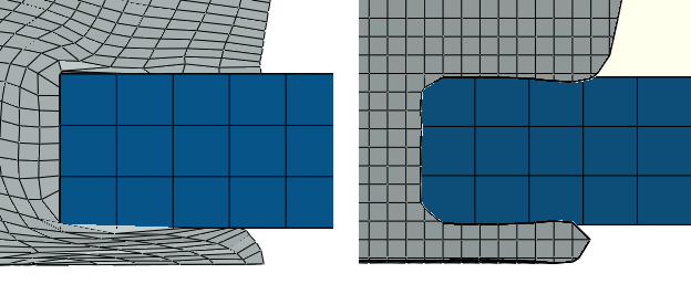 ![]() Figure 7. Deformed configuration for the pure Lagrangian case (left) and the CEL case (right).