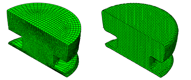 The following sections detail some modeling techniques that are common to both analysis cases. Analysis typesBoth analysis cases are conducted using quasi-static explicit dynamic procedures. The forming takes place over the course of a single step lasting 1 ms. MaterialsThe material for the rivet uses an isotropic hardening Mises plasticity model. The stress-strain data points used to define the plastic behavior are shown in Table 1. Boundary conditionsIn both analysis cases the plate and dies are modeled as Lagrangian bodies imposed with rigid body constraints. A boundary condition preventing displacements and rotations is imposed on the reference point for the plate body. Boundary conditions are also applied to each die reference point to prevent them from rotating or displacing, except in the vertical 3-direction: the boundary condition on the top reference point displaces it 3 mm in the negative 3-direction, and the boundary condition on the bottom reference point displaces it 2 mm in the positive 3-direction. The application of the boundary conditions is governed by an amplitude that ramps the displacement linearly from zero to full displacement over the course of 0.8 ms; the dies are then fixed in place for the final 0.2 ms of the analysis. ConstraintsAs mentioned above, rigid body constraints are applied to the plate and two dies. These components are assumed to be significantly harder than the rivet, and they do not deform during the forming process. The rigid body constraints improve computational efficiency and allow the use of simple boundary conditions to initiate the forming. Output requestsField output is specifically requested for the equivalent plastic strains in the model (PEEQ). In addition, history output for the reaction force in the 3-direction (RF3) is requested at the reference point for each of the dies. Pure Lagrangian analysis caseThe first analysis case uses four Lagrangian bodies meshed from discrete geometric part instances. In the pure Lagrangian case the geometry of the model corresponds directly to the shapes of the parts being modeled, making the assembly process fairly intuitive. Mesh designThe rivet is meshed with C3D8R elements using a global mesh seed of 0.25 mm (see Figure 4). The plate and dies are also meshed with C3D8R elements, but the rigid body constraints applied to these parts makes the element selection somewhat arbitrary. Unmeshed analytical rigid surfaces could have been used to model the plate and dies, but rigid body constraints are used to maintain consistency with the CEL model. InteractionsA general contact definition enforces contact interactions between all bodies in the model. A frictionless, hard contact model governs all interactions. Solution controlsAlthough large deformations are expected in the analysis, no special solution controls or analysis techniques (such as adaptive meshing) are applied to the model, allowing a straightforward comparison between the pure Lagrangian model and the CEL model. CEL analysis caseIn the second analysis case the rivet is modeled using Eulerian elements. The plate and dies are still rigid bodies. The modeling approach in the CEL analysis has some distinct differences from the pure Lagrangian case. Mesh designIn the Eulerian formulation the mesh does not generally correspond to the geometry of the part being modeled; rather, the placement of the material within the Eulerian mesh defines the geometry of the part. The Eulerian mesh does not deform or displace; only the materials within the mesh can move. Typically, the Eulerian mesh is an arbitrary collection of regular hexahedral elements that fully encompasses the region in which material may exist during the analysis. In this example the Eulerian part is a rectangular prism measuring 17 × 17 × 11.5 mm meshed with EC3D8R elements. A global mesh seed of 0.25 mm dictates the element size. This mesh does not define the geometry of the rivet; rather, the mesh defines the domain in which the rivet material can exist. The rivet geometry is defined by assigning steel material to a portion of this mesh corresponding to the shape of the rivet, as discussed in the Initial conditions section below. One strength of the Eulerian technique is the ability to define a regular, high-quality mesh independent of the geometry of the part being modeled. It is important that the Eulerian mesh is large enough to contain the rivet material completely as it deforms; if material reaches the edge of the mesh, it flows out of the model and is lost to the simulation. Initial conditionsThe rivet geometry is defined using a material assignment initial condition on the Eulerian mesh. The material assignment specifies which elements in the mesh initially contain steel. Each element is designated a percentage (known as the volume fraction), which represents the portion of that element filled with steel. For partially filled elements Abaqus positions the material in the element such that it forms a continuous surface with the material in adjacent elements. The end result is a distribution of material in the mesh corresponding to the rivet geometry, as seen in Figure 5. You can use the view cut manager in the Visualization module of Abaqus/CAE to visualize the extent of a material within an Eulerian mesh, as discussed in Viewing output from Eulerian analyses. The material assignment is created with the aid of the volume fraction tool in Abaqus/CAE. The volume fraction tool calculates the overlap between an Eulerian mesh and some reference geometric part. To use the volume fraction tool for this analysis case, the entire Lagrangian assembly (including the Lagrangian rivet) is copied from the previous analysis case and positioned inside the Eulerian mesh (see Figure 6). The Lagrangian rivet serves as the reference part, and the volume fraction tool creates a discrete field that associates each element in the Eulerian mesh with a volume fraction based on the amount of space occupie