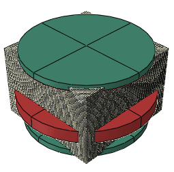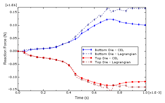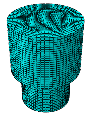 The displacements during the forming simulation indicate whether or not the rivet deforms appropriately. After the deformation, the strength of the rivet is based largely on its material properties; examining the equivalent plastic strain in the rivet gives some indication of potential damage or strength degradation in the material. To assess the effect of the rivet on the installation tool, reaction forces in the tool can be compared to known force capacities in standard installation tools. GeometryThe rivet used in these analyses is a simple multidiameter cylinder, as described above. To aid the deformation of the smaller end of the rivet, a hemispherical portion is removed from the center of the cylinder. Figure 2 shows the dimensions of the rivet model. To simulate the forming, the rivet is placed in a hole at the center of a circular plate. Circular dies representing the installation tool are positioned at the top and bottom end of the rivet (see Figure 3). MaterialsThe rivet in this model is composed of an elastic-plastic steel with a density of 7.85 × 10−9 t/mm3, Young's modulus of 2.1 × 105 N/mm2, Poisson's ratio of 0.266, and the onset of plastic yielding occuring at 3.0 × 105 N/mm2. The plate and dies are assumed to be significantly harder than the rivet, and no deformation of these parts is expected. Boundary conditions and loadingThe forming process is simulated through the enforcement of displacement boundary conditions. The plate is constrained to a fixed location. The top die is displaced downward a distance of 3 mm, while at the same time the bottom die is displaced upward a distance of 2 mm. InteractionsContact interactions must be enforced between the rivet and all installation tool components; the deformation of the rivet depends on contact loads delivered through the displacement of the tool. The tool components never come into contact with each other, so interactions between the plate and dies can be neglected. Abaqus modeling approaches and simulation techniquesThe rivet forming simulation is conducted in Abaqus/Explicit using two fundamentally different element formulations. The traditional Lagrangian formulation generally offers accuracy and computational efficiency, but pure Lagrangian models tend to exhibit mesh distortion and an associated loss of accuracy when undergoing extreme deformations. The Eulerian formulation trades some accuracy of geometry and results for robustness in analyses involving very large deformations; in situations where the Lagragian formulation yields an unreliable solution or no solution at all, the Eulerian formulation can be used to obtain a reasonable solution. Lagrangian and Eulerian elements can be combined in the same model using a technique known as coupled Eulerian-Lagrangian (CEL) analysis. In a CEL analysis bodies that undergo large deformations are meshed with Eulerian elements, while stiffer bodies in the model are meshed with more efficient Lagrangian elements. The rivet forming analysis is performed using both a pure Lagrangian approach, in which the rivet, plate, and dies are all modeled with Lagrangian elements; and a coupled Eulerian-Lagrangian approach, in which the rivet is modeled with Eulerian elements while the plate and dies are modeled with Lagrangian elements. Summary of analysis cases