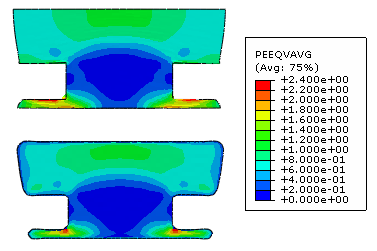 ![]() Figure 9. Equivalent plastic strain in the pure Lagrangian model (top) and the CEL model (bottom).