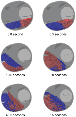 ![]() Figure 2. Case 1: Snapshots of the mixing process for limestone pellets.