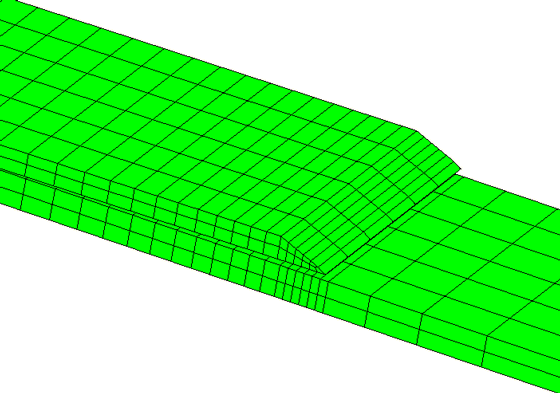 ProductsAbaqus/Standard The particular problem considered here is described in Davila (2003); it consists of a stringer flange bonded onto a skin, originally developed by Krueger (2000). The results presented are compared against the experimental results presented in Davila (2003). The problem is analyzed in Abaqus/Standard using a damaged, linear elastic constitutive model for the skin/stiffener interface. Geometry and modelThe problem geometry and loading are depicted in Figure 1: a 203-mm-long and 25.4-mm-wide specimen with a total skin thickness of 2.632 mm and maximum flange thickness of 1.88 mm, loaded in tension along the length direction. For the model in which the loading is simulated through prescribed displacements, the free gauge length is 127 mm. The skin thickness direction is comprised of 14 composite plies; while the flange is made up of 10 plies, each having a uniform thickness of 0.188 mm. The finite element mesh for the three-dimensional model of the debonding problem is identical to that used in Davila (2003) except that the “decohesion” elements utilized in that reference to represent the skin/flange interface are replaced with Abaqus cohesive elements. Both the skin and the flange are modeled by two layers each of C3D8I elements. The interface between them is represented by COH3D8 elements, with the cohesive element mesh sharing nodes with the matching C3D8I meshes of the flange and the skin on either side. The model has a total of 828 solid elements and 174 cohesive elements. As stated in Davila, the two tapered ends of the flange are discretized differently to eliminate model symmetry and to prevent simultaneous delamination from occurring at both ends. The analysis includes a thermal loading step prior to the mechanical loading to simulate the residual stresses in the specimen due to a difference of 157°C between the curing temperature and room temperature. The temperature difference causes residual stresses at the skin/flange interface due to the fact that the thermal expansion coefficients of both the skin and flange material are orthotropic (even though they are specified to be the same) and the ply layups in the skin and flange are different. MaterialThe material data, as given in Davila (2003), are reproduced below. Composite material properties: