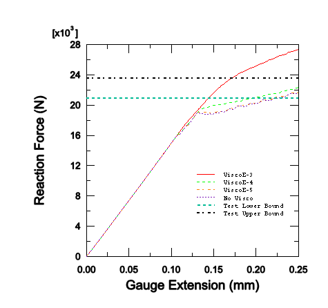 The elastic properties of the interface material are defined using uncoupled traction-separation behavior (see Defining elasticity in terms of tractions and separations for cohesive elements), with stiffness values of E= 1.0 × 106 MPa, = 1.0 × 106 MPa, and = 1.0 × 106 MPa. The quadratic traction-interaction failure criterion is chosen for damage initiation in the cohesive elements; and a mixed-mode, energy-based damage evolution law based on the Benzeggagh-Kenane criterion is used for damage propagation. The relevant material data are as follows: =61 MPa, = 68 MPa, = 68 MPa, = 0.075 N/mm, = 0.547 N/mm, = 0.547 N/mm, and = 1.45. Results and discussionThe deformed geometry is given in Figure 2, which clearly shows the flange separation from the skin. In Figure 3 the load-extension predictions are compared with the experimental data presented by Davila (2003). The initiation of delamination is marked by the sharp slope change of the curves. The results presented here are obtained using three different viscous regularizations; i.e., , , and . Higher viscosity provides better convergence but also affects the results more than lower viscosity. The results using are close to the ones without viscosity, while the results using agree best with the experimental results in terms of debonding initiation. Input files