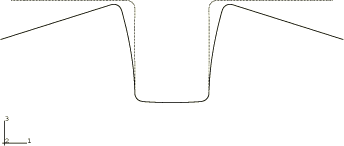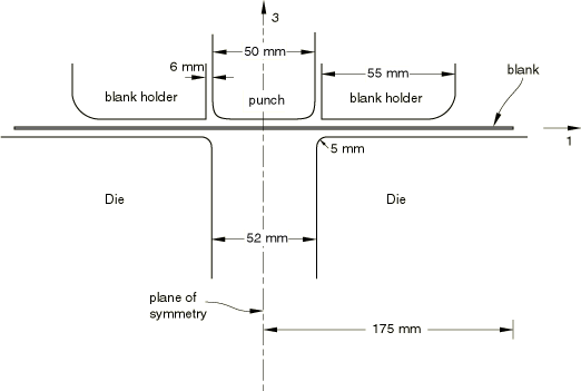 ProductsAbaqus/StandardAbaqus/Explicit Problem descriptionThe example described here is one of the benchmark tests reported at the Numisheet '93 Conference. The benchmark contains a series of six problems performed with three different materials and two different blank holder forces. One of the six problems is described here. The simulations for all the problems are described in the paper by Taylor et al. (1993). The blank initially measures 350 mm by 35 mm and is 0.78 mm thick. The problem is essentially a plane strain problem (the out-of-plane dimension for the blank is 35 mm). A cross-section of the geometry of the die, the punch, the blank holder, and the blank is shown in Figure 1. The total blank holder force is 2.45 kN, and a mass of 5 kg is attached to the blank holder. A coefficient of friction of 0.144 is used for all interacting surfaces. The blank is made of mild steel. The material is modeled as an elastic-plastic material with isotropic elasticity, using the Hill anisotropic yield criterion for the plasticity. The following material properties are used: