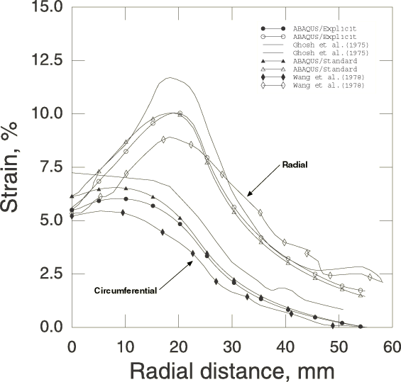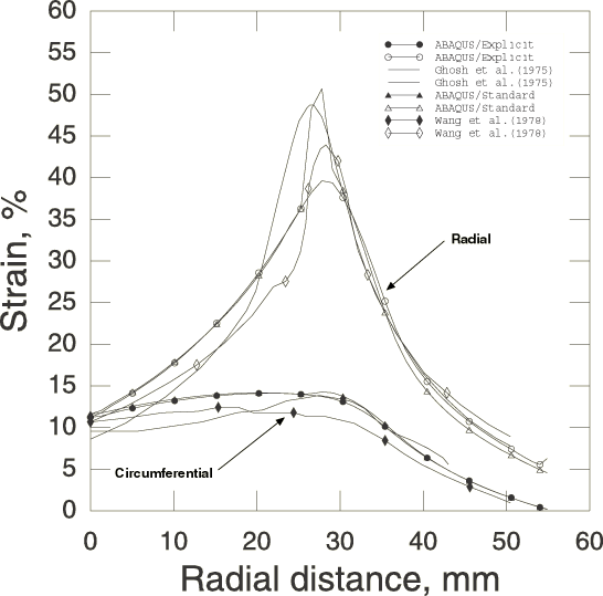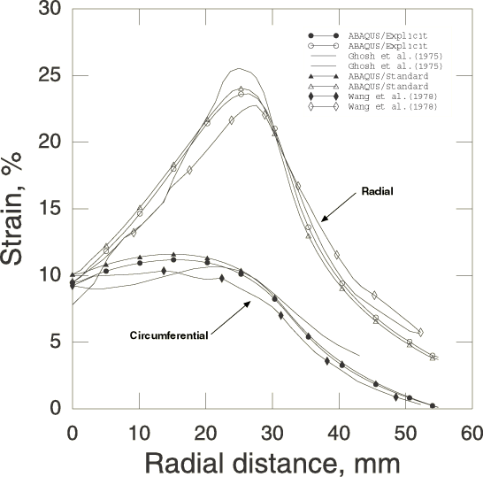 ProductsAbaqus/StandardAbaqus/Explicit Stamping of sheet metals by means of rigid punches and dies is a standard manufacturing process. In most bulk forming processes the loads required for the forming operation are often the primary concern. However, in sheet forming the prediction of strain distributions and limit strains (which define the onset of local necking) are most important. Such analysis is complicated in that it requires consideration of large plastic strains during deformation, an accurate description of material response including strain hardening, the treatment of a moving boundary that separates the region in contact with the punch head from the unsupported one, and the inclusion of friction between the sheet and the punch head. Geometry and modelThe geometry of this problem is shown in Figure 1. The sheet being stretched has a clamping radius, , of 59.18 mm. The radius of the punch, , is 50.8 mm; the die radius, , is 6.35 mm; and the initial thickness of the sheet, , is 0.85 mm. Such a sheet has been tested experimentally by Ghosh and Hecker (1975) and has been analyzed by Wang and Budiansky (1978) using an axisymmetric membrane shell finite element formulation. The analysis is conducted statically in Abaqus/Standard and dynamically in Abaqus/Explicit such that inertial forces are relatively small. The initial configuration for the analysis is shown in Figure 2. The sheet, the punch, and the die are modeled as separate parts, each instanced once. As an axisymmetric problem in Abaqus/Standard the sheet is modeled using 50 elements of type SAX1 (or MAX1) or 25 elements of type SAX2 (or MAX2). The Abaqus/Explicit model uses 50 elements of type SAX1. Mesh convergence studies (not reported here) have been done and indicate that these meshes give acceptably accurate results for most of the values of interest. To test the three-dimensional membrane and shell elements in Abaqus/Standard, a 10° sector is modeled using 100 elements of type S4R, S4, SC8R, or M3D4R or 25 elements of type M3D9R. All these meshes are reasonably fine; they are used to obtain good resolution of the moving contact between the sheet and the dies. In the Abaqus/Standard shell models nine integration points are used through the thickness of the sheet to ensure the development of yielding and elastic-plastic bending response; in Abaqus/Explicit five integration points are used through the thickness of the sheet. The rigid punch and die are modeled in Abaqus/Standard as analytical rigid surfaces with a surface in conjunction with a rigid body constraint. The top and bottom surfaces of the sheet are defined with surface definitions. In Abaqus/Explicit the punch and die are modeled as rigid bodies; the surface of the punch and die are modeled either by analytical rigid surfaces or RAX2 elements. In the Abaqus/Explicit analyses the rigid surfaces are offset from the blank by half the thickness of the blank because the contact algorithm in Abaqus/Explicit takes the shell thickness into account. Similarly, when the surface-to-surface contact formulation in Abaqus/Standard is used, the blank thickness is considered by default and the rigid surfaces are offset from the blank by half the blank thickness, consistent with the physical reality. However, most of the input files presented in this section use the node-to-surface contact formulation in Abaqus/Standard. In these cases the shell thickness is ignored, and the mid-surface of the shell is used in the contact calculations as an approximation. Material propertiesThe material (aluminum-killed steel) is assumed to satisfy the Ramberg-Osgood relation between true stress and logarithmic strain, where Young's modulus, E, is 206.8 GPa; the reference stress value, K, is 0.510 GPa; and the work-hardening exponent, n, is 4.76. In the present Abaqus analyses the Ramberg-Osgood relation is approximated using an elastic-plastic material. The material is assumed to be linear elastic up to a yield stress of 170.0 MPa, and the stress-strain curve beyond the yield stress is defined in piecewise linear segments. Poisson's ratio is 0.3. The membrane element models in Abaqus/Standard are inherently unstable in a static analysis unless some prestress is present in the elements prior to the application of external loading. Therefore, an equibiaxial initial stress condition equal to 5% of the initial yield stress is prescribed for the membrane elements in Abaqus/Standard. Contact interactionsThe contact between the sheet and the rigid punch and the rigid die is modeled with a contact pair. The mechanical interaction between the contact surfaces is assumed to be frictional contact, with a coefficient of friction of 0.275. LoadingThe Abaqus/Standard analysis is carried out in five steps; the Abaqus/Explicit analysis is carried out in four steps. In Abaqus/Explicit the velocity of the punch head is prescribed using a velocity boundary condition whose amplitude is ramped up to 30 m/s at 1.24 milliseconds during the first step and then kept constant until time reaches 1.57 milliseconds at the end of the second step. It is then ramped down to zero at a time of 1.97 milliseconds at the end of the third step. In the first three steps of the Abaqus/Standard and Abaqus/Explicit analyses, the punch head is moved toward the sheet through total distances of 18.6 mm, 28.5 mm, and 34.5 mm, respectively. The purpose of these three steps is to compare the results with those provided experimentally by Ghosh and Hecker for these punch displacements. More typically the punch would be moved through its entire travel in one step. Two final steps are included in the Abaqus/Standard analysis. In the first step the metal sheet is held in place and the contact pairs are removed from the model. In the second step the original boundary conditions for the metal sheet are reintroduced for springback analysis. However, this springback step is not included for the analyses using membrane elements, since these elemen
