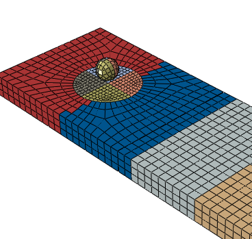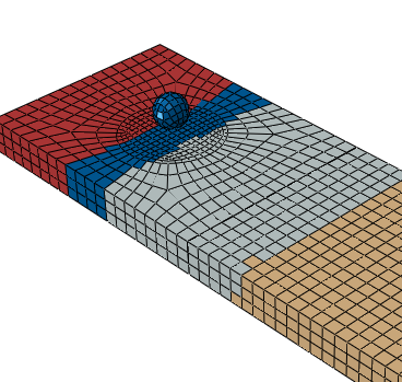 Separate domain decomposition regions may be desired, for example, in bird-strike models (where contact-impact activity is highly localized and time dependent) and coupled Eulerian-Lagrangian problems with localized adaptive mesh refinement (where elements are refined adding to the computational cost). The example below (Figure 1) shows a spherical projectile impacting a flat plate with a failure model, thus allowing the projectile to perforate the plate. One of the domains contains the projectile as well as a significant portion of the impact area. Specifying a domain decomposition region consisting of the projectile as well as the computationally intensive impact area results in a more balanced parallel processing (Figure 2). In this example and ; therefore, . Figure 1. Original domain decomposition.