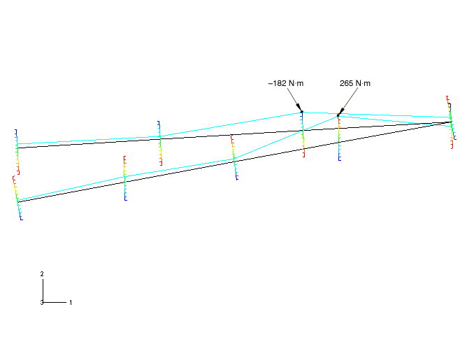 Figure 4. Bending moment diagram (moment about beam 1-axis) for elements in display group MainA. The locations with the highest stress (created by the bending of the elements) are indicated.