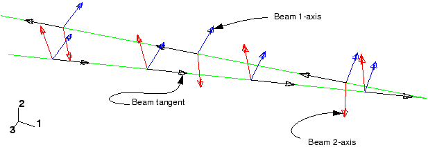The resulting plot is shown in Figure 2. The text annotations in Figure 2 that identify the section axes and beam tangent will not appear in your image. The vector showing the local beam 1-axis, , is blue; the vector showing the beam 2-axis, , is red; and the vector showing the beam tangent, , is white.