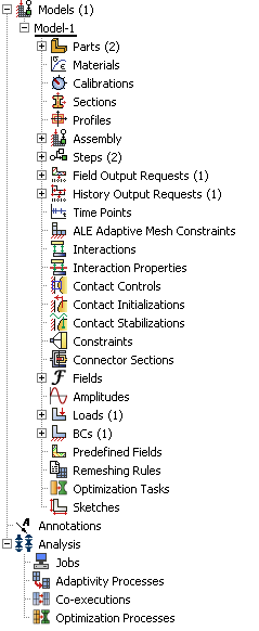 ![]() Items in the Model Tree are represented by small icons; for example, the Steps icon, The arrangement of the containers and items in the Model Tree reflects the order in which you are expected to create your model. As noted earlier, a similar logic governs the order of modules in the module menu—you create parts before you create the assembly, and you create steps before you create loads. This arrangement is fixed—you cannot move items in the Model Tree. The Model Tree provides most of the functionality of the main menu bar and the module managers. For example, if you double-click on the Parts container, you can create a new part (the equivalent of selecting from the main menu bar). The instructions for the examples that follow will focus on using the Model Tree to access the functionality of Abaqus/CAE. Menu bar actions will be considered only when necessary (e.g., when creating a finite element mesh or postprocessing results). |