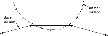 In the pure master-slave approach one of the surfaces is the master surface and the other is the slave surface. As the two bodies come into contact, the penetrations are detected and the contact constraints are applied according to the constraint enforcement method (kinematic or penalty). Pure master-slave weighting (regardless of the constraint enforcement method) will resist only penetrations of slave nodes into master facets. Penetrations of master nodes into the slave surface can go undetected, as shown in Figure 1, unless the mesh on the slave surface is adequately refined.