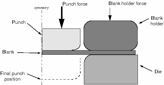 The problem consists of a strip of deformable material, called the blank, and the tools—the punch, die, and blank holder—that contact the blank. The tools are modeled as (analytical) rigid surfaces because they are much stiffer than the blank. Figure 1 shows the basic arrangement of the components. Figure 1. Forming analysis.