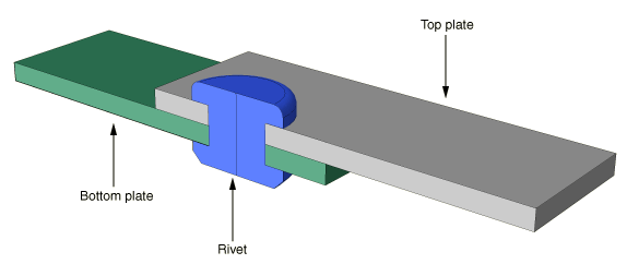The model consists of two overlapping aluminum plates that are connected with a titanium rivet. The left end of the bottom plate is fixed, and the force is applied to the right end of the top plate to shear the joint. Figure 1 shows the basic arrangement of the components. Because of symmetry, only half of the joint is modeled to reduce computational cost. Frictional contact is assumed. Figure 1. Lap joint analysis.