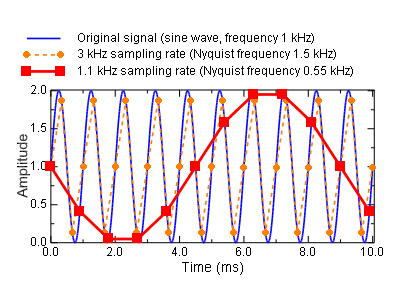 Consider the data recorded with a sample rate of 1.1 kHz; this rate is less than the required 2 kHz rate. The resulting curve exhibits alias distortions because it is an extremely misleading representation of the original 1 kHz sine wave.