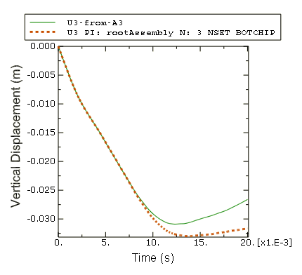 In the Results Tree, click mouse button 3 on the velocity V3 history output for the node in set BotChip; and select Add to Plot from the menu that appears.